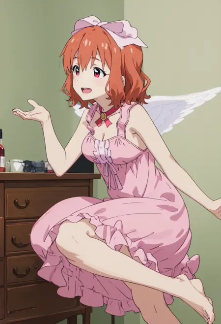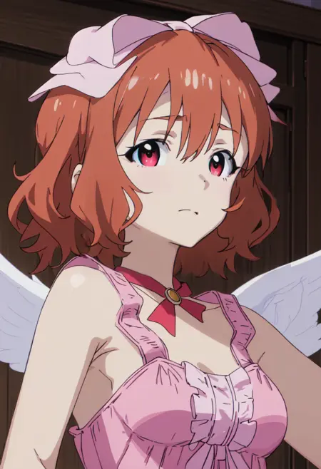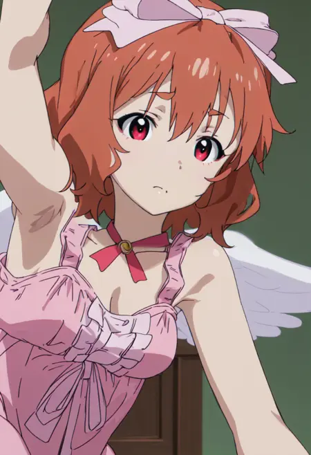 - 축소된 캐릭터 태그는 짧은 머리카락, 날개, 리본, 머리 리본, 가슴, 갈색 머리카락, 주황색 머리카락, 중간 크기 가슴, 분홍색 리본, 리본, 빨간 눈, 천사 날개입니다. 캐릭터의 핵심 특징(예: 머리 색)이 안정적이지 않을 때 이 태그를 프롬프트에 추가할 수 있습니다.