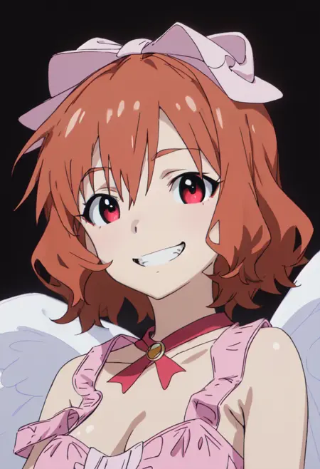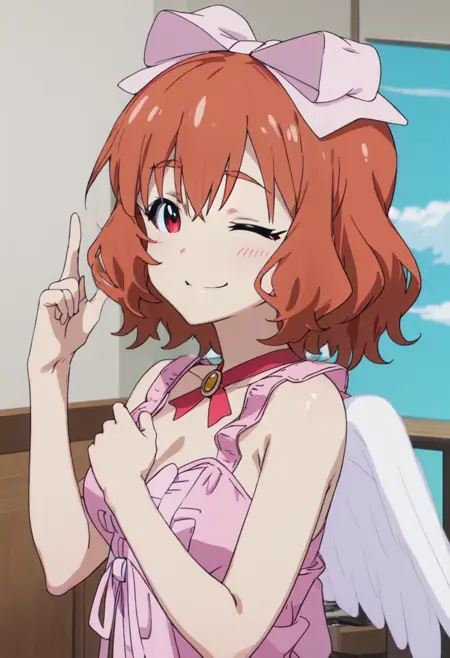 触发词为 hiyori_kotobuki_imocho,修剪后的标签为 short_hair, wings, bow, hair_bow, breasts, brown_hair, orange_hair, medium_breasts, pink_bow, ribbon, red_eyes, angel_wings。当某些特征(如发色)有时不够稳定时,您可以在提示词中加入这些标签。