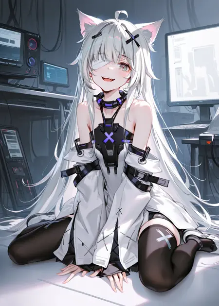 -->1girl, no.21_XXI, 长发, X形发饰, 灰色眼睛, 可拆卸袖子, 天线辫, 白色连衣裙, 动物耳朵, 无人机, 白色头发, 一只眼睛缠着绷带, 黑色过膝袜