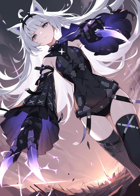 -->1girl, No.21_野性气息, 长发, 黑色发带, 灰色眼睛, 可拆卸袖子, 天线辫, 黑色连衣裙, 黑色紧身衣, 动物耳朵, 异色瞳, 白色头发XXI