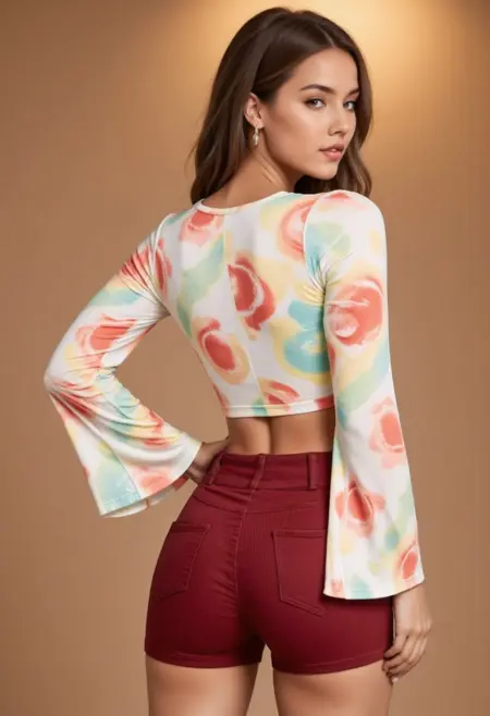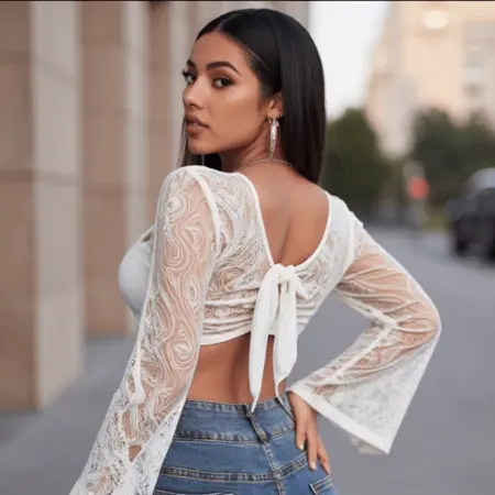 영감을 얻기 위해 포함된 샘플 이미지들은 다양한 스타일, 색상 및 소재를 탐색할 수 있는 훌륭한 시작 프롬프트를 제공합니다. 긴 소매 앞쪽 매듭 톱 LoRA를 활용하여 독특한 패션 아이디어를 구현해보세요!