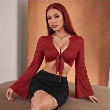 T1eMeUp, 앞매듭 탑, 플레어 소매, 핏된 탑, 스타일리시한 패션, (소재: 레이스, 벨벳, 실크, 면, 리브 니트), (원하는 색상), 패셔너블한 아우터, 캐주얼 복장, 우아함, 하이웨이스트 바지, 날씬한 핏