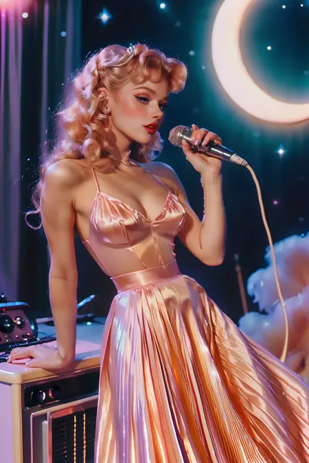 1940年代のビンテージ写真、夢のある照明、砂漠の丘に立つ、流れるような白いドレスをまとった幽霊のような女性。左手中に輝く白い星の光を掲げ、右腕を伸ばしている。その顔は穏やかで、繊細で空想的なヴェールを纏っている。星々がきらめく空に、きらめく三日月が浮かび、ビンテージでゴージャス。