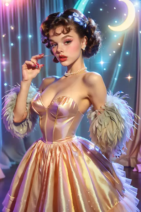 **1940s vintage photograph,dreamy lighting,**a ghostly woman with a flowing white dress standing on a desert hill. She holds a glowing white star light in her left hand, with her right hand extended. Her face is serene, and she wears a delicate, ethereal veil, starry background with a glitter crescent moon, vintage glamorous.