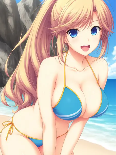 衣装04、ビキニ、青いビキニ、ストリングビキニ、黄色のストリング、ハーネックビキニトップ、模様入りビキニトップ、サイドタイで留めるビキニボトム、