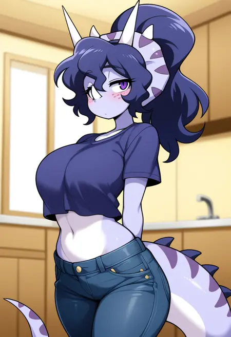 Sera_Snoot_Game、トリケラトプス、スケリー、アンスロ、尾、まつ毛、そばかす、フリル(解剖学的)、紫色の髪、色付き肌、紫色の肌、紫色の目