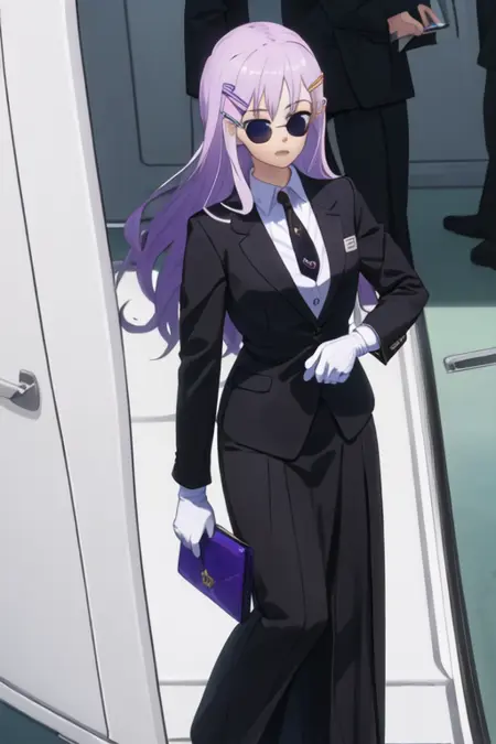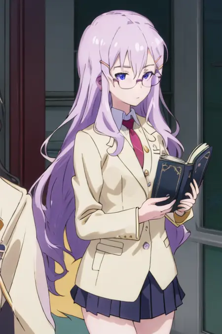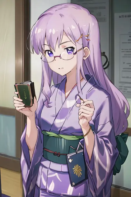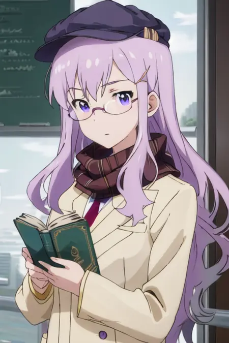 トリガー語はneko_imocho、推奨タグはbest quality, masterpiece, highres, solo, {neko_imocho:1.15}, glasses, long_hair, purple_hair, purple_eyes, hair_ornament, hairclip, blue_eyesです。