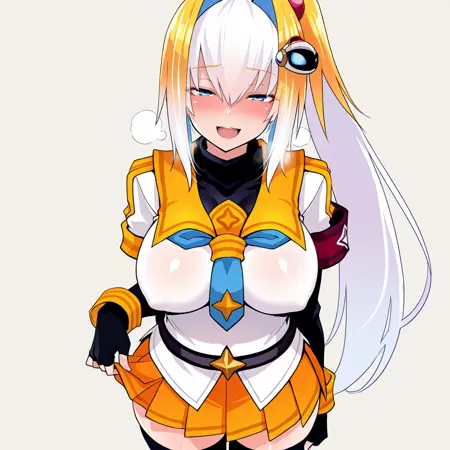 衣装: スカート、ネクタイ、フィンガーレスグローブ、グローブ、オレンジのスカート、ブラックのタイツ、絶対領域、不可能な服、学ラン,