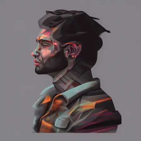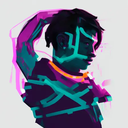 例如:一个戴着辫子和连帽衫的男人,低头看着远处某物,伴有粉红色光线的数字插画,艺术风格由 flonixsdviewv3 创作