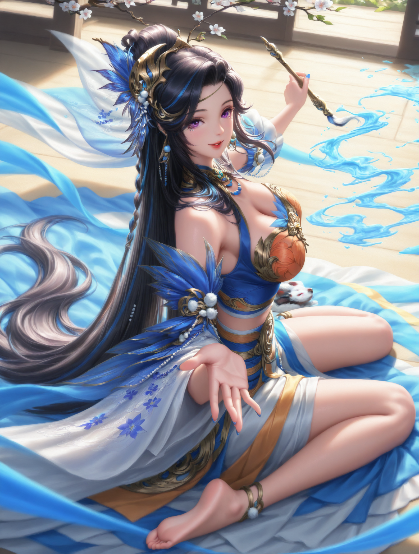 1girl,bare shoulders,black hair,blue hair,branch,breasts,detached sleeves,earrings,flower,hair ornament,holding,jewelry,long hair,looking at viewer,multicolored hair,paintbrush,purple eyes,solo,very long hair,wariza,water,