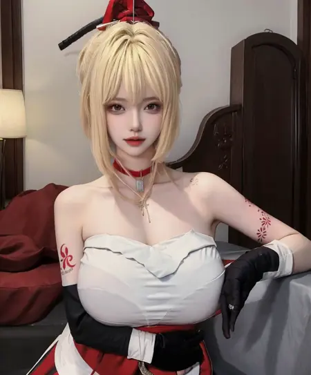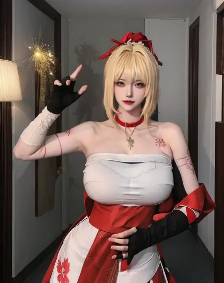 正面提示词推荐;killer,yoimiya \(genshin impact\),1girl,blonde hair,sarashi,tattoo,choker,gloves,looking at viewer,chest tattoo,(indoor),red necklace,arm_tattoo,chest tattoo,hair decoration,single shoulder bare,(standing),Yoimiya,(simple_background),