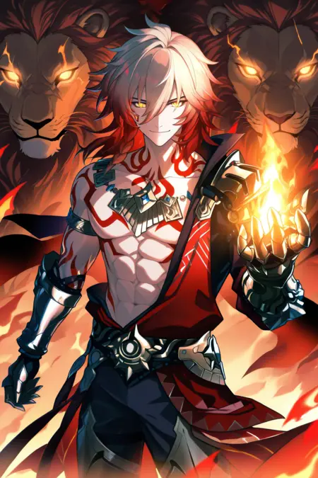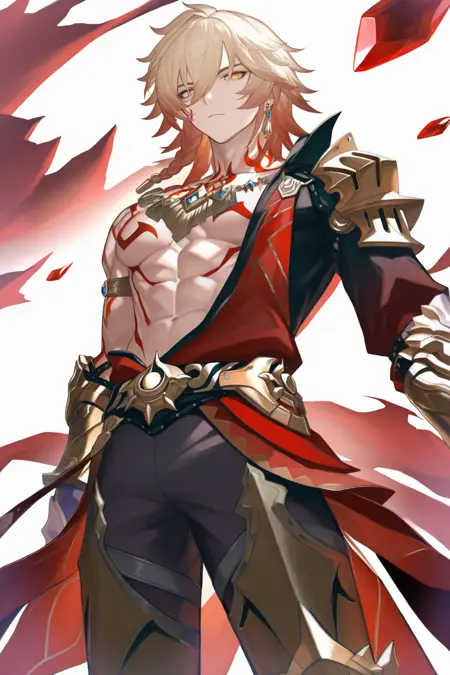 mydei \(호카이 스타 레일\), 남성 중심, 빨간 눈, 1소년, 금발, 문신, 다색 머리, 장갑, 싱글 포커스, 시청자 바라보기, 풀바디, 땋은 머리, 장갑, 귀걸이, 눈 사이의 머리