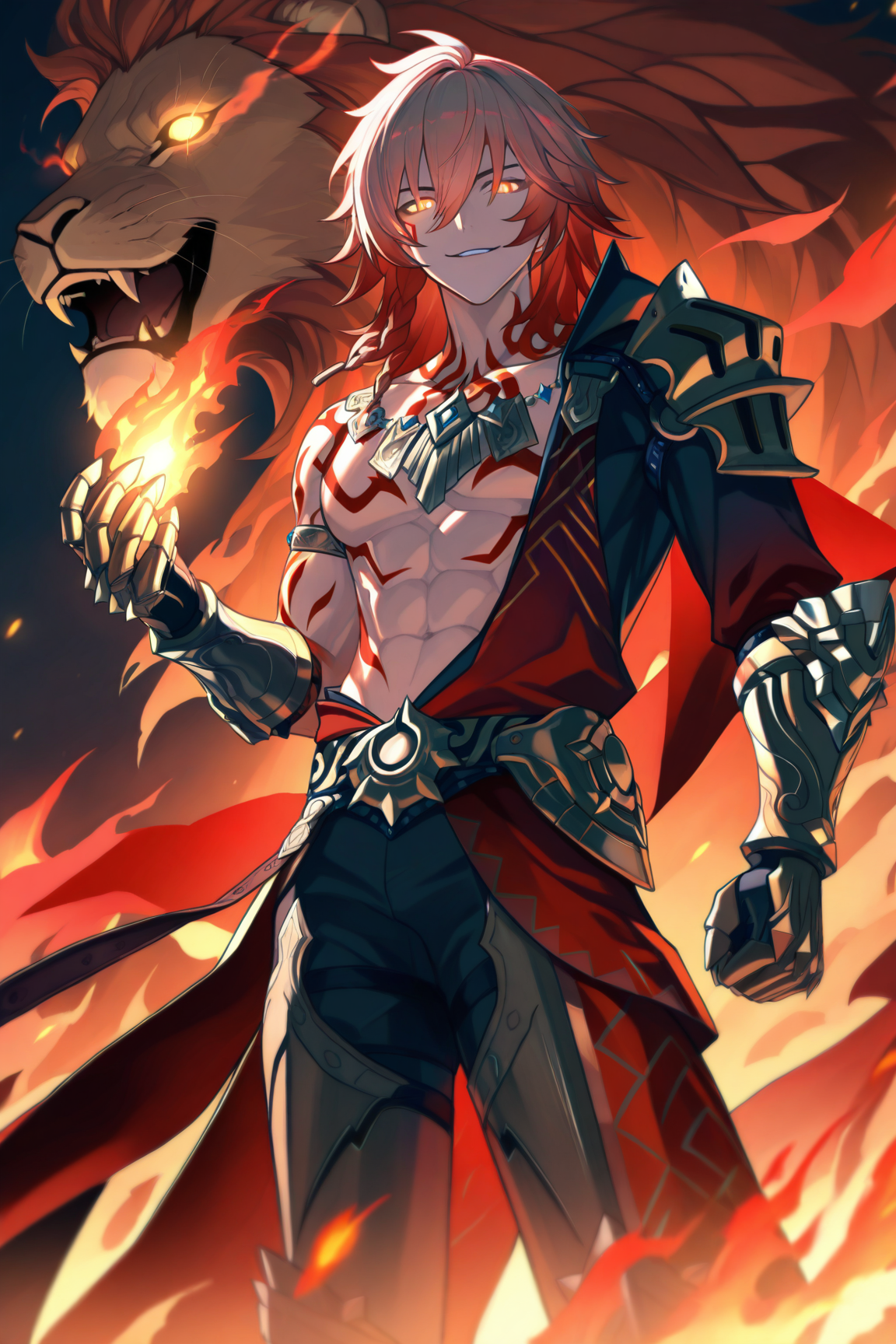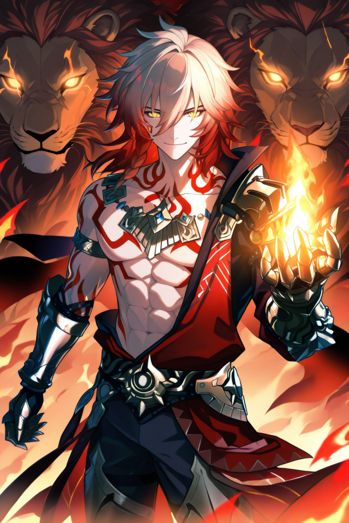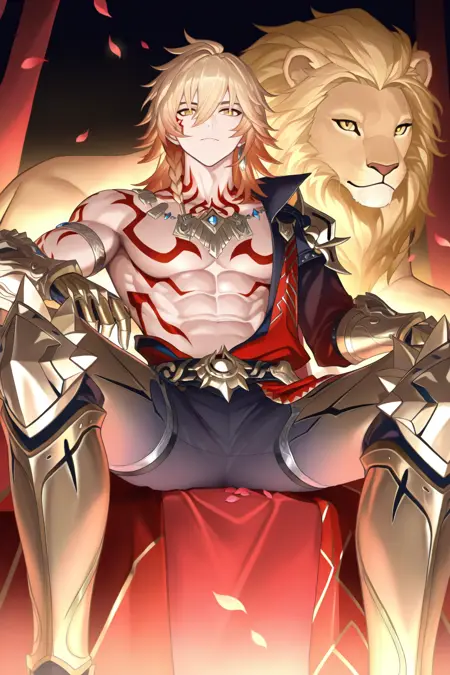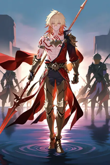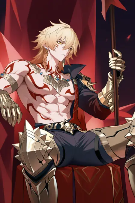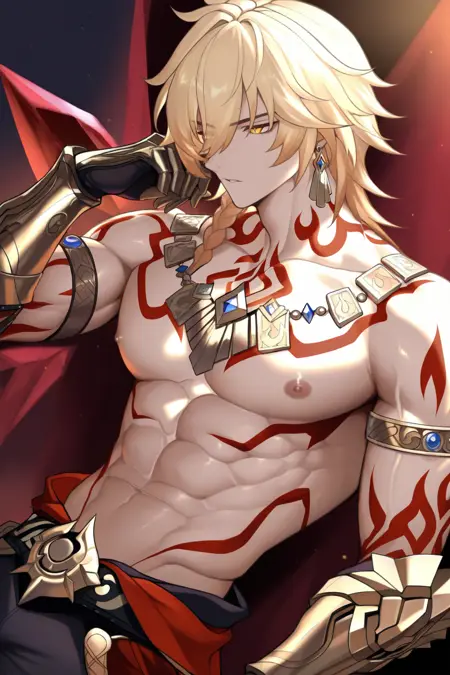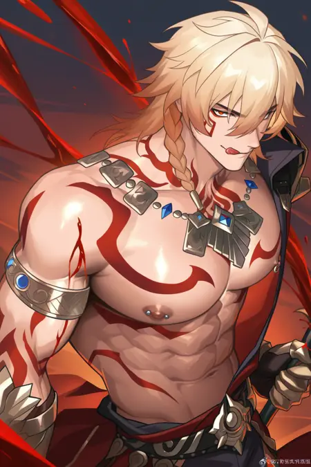 mydei \(崩坏:星穹铁道\),男性焦点,红眼睛,1个男孩,金发,纹身,多色头发,护手,单人焦点,注视观众,全身,辫子,护手,耳环,头发遮住眼睛,