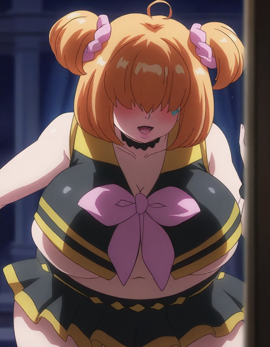 E9,orange hair, short hair, hair bangs, hair over eyes, ahoge, twintails, lips,blue heart print on face,huge breasts,plump,chuby,fat,thick thighs,wide hips,black lace choker,