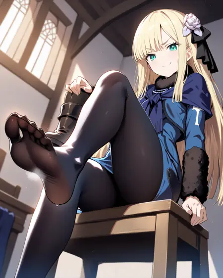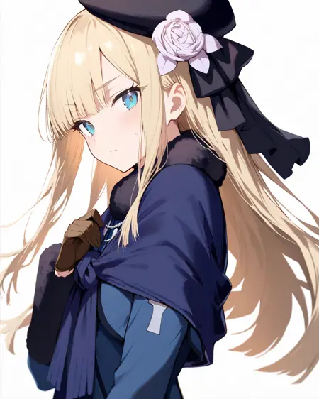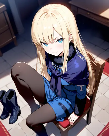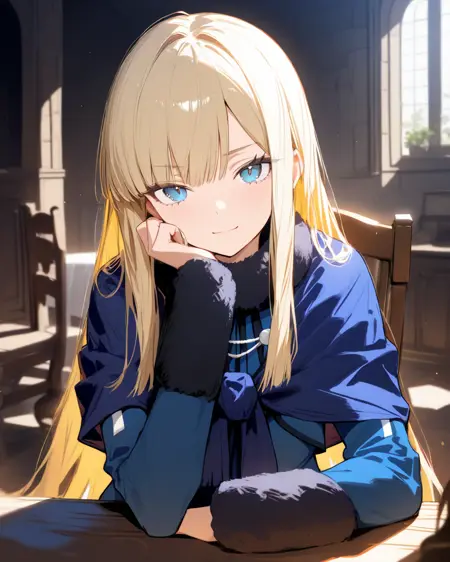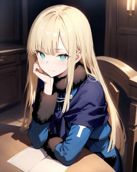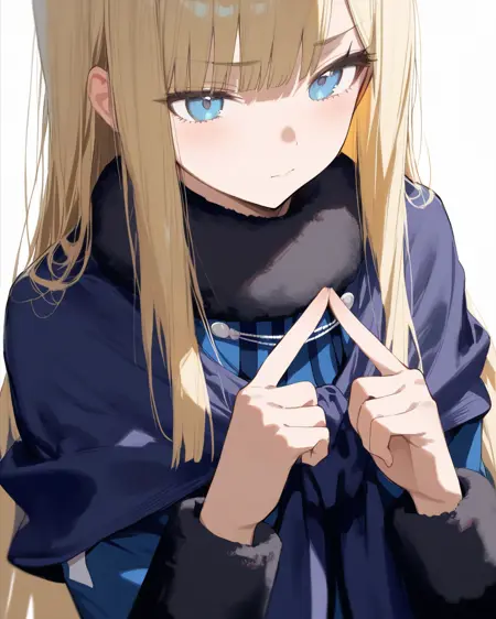 blonde hair, long hair, blue eyes, sidelocks, blunt bangs, straight hair