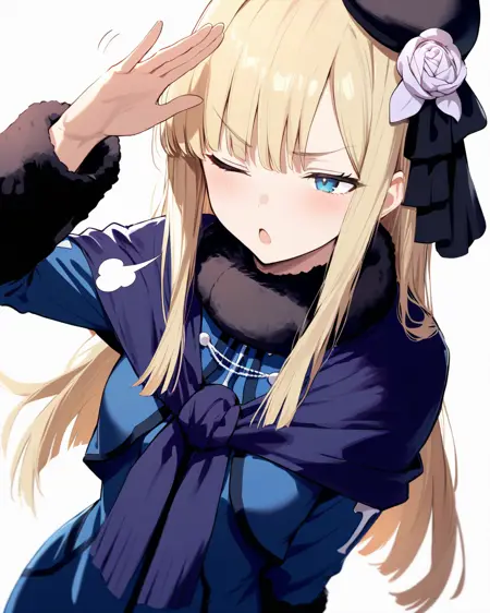 hat, hair flower, fur collar, blue capelet, blue jacket, long sleeves, fur-trimmed sleeves, gloves, blue dress, black pantyhose, ankle boots