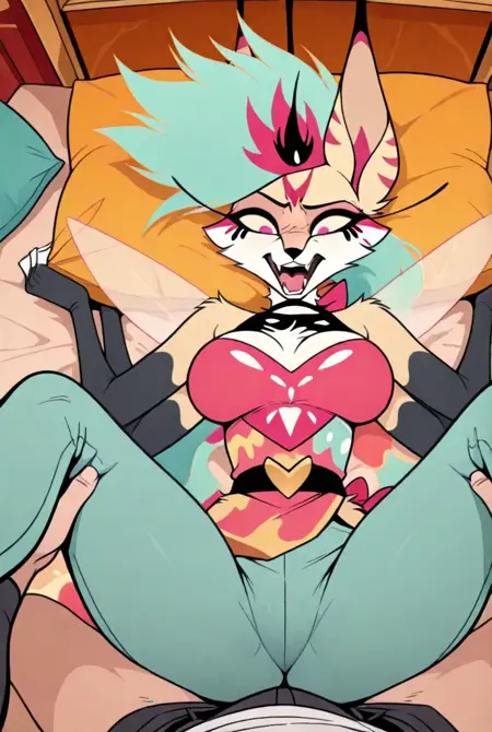 Beelzebub,furry female,fox,multicolored hair,Green mint hair, pink eyes, yellow sclera,long eyelashes,yellow fur, white fur, striped ears, multicolored midriff,wings, pair of pixie wings, four arms,choker, off-shoulder top, pink crop top, black bra, clothing cutout, midriff, pink shorts