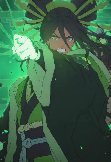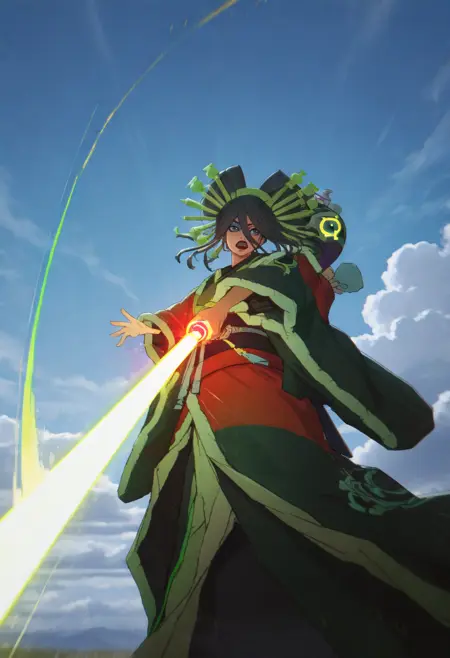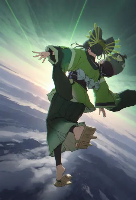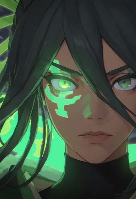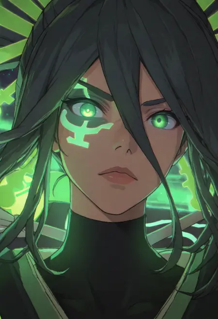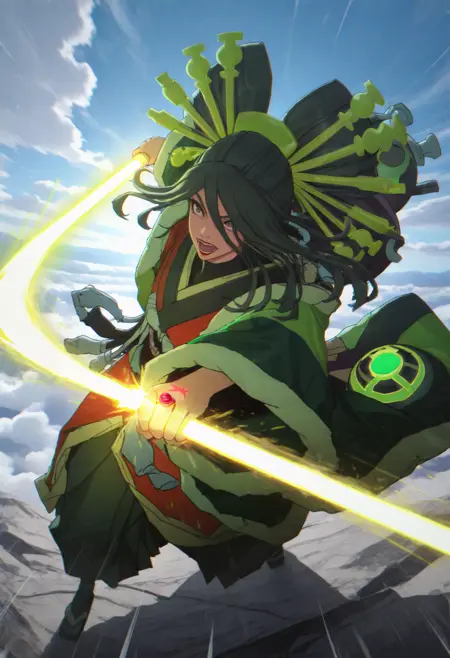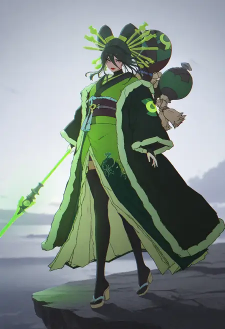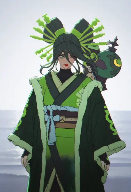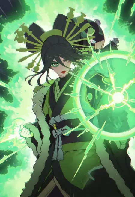触发词:Zeshika_The_Emerald_RAY, 长袖,日本服饰,和服,毛皮镶边,妆容,脏辫,绿色能量戒指,