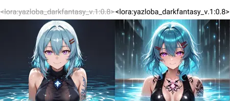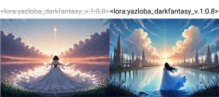 이 LoRA는 lora:yazloba_darkfantasy_v.1:0.6에서 lora:yazloba_darkfantasy_v.1:0.9 범위의 파라미터와 함께 사용할 때 더 정교한 디테일과 풍부한 질감을 제공합니다. 우울하고 판타지적인 세계를 창조하고 싶다면, 이 도구가 완벽한 선택입니다.