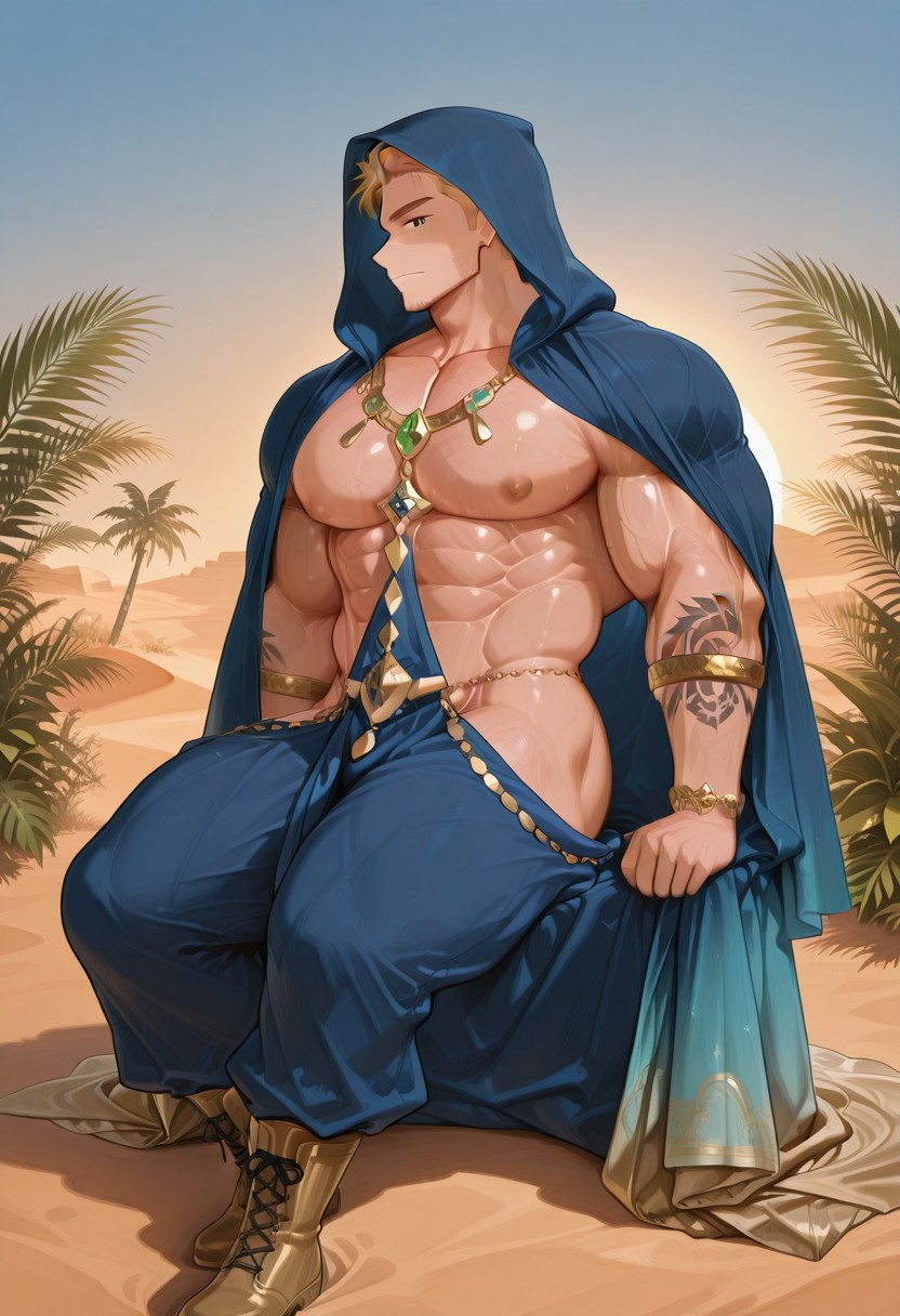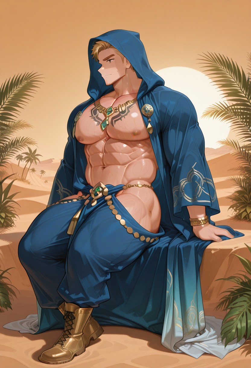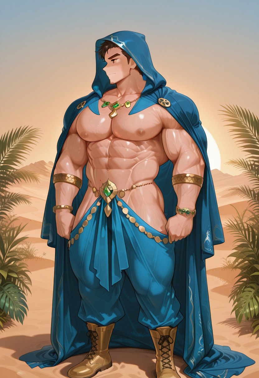 5k1mpy_r0be, 후드 달린 로브 착용, 하렘 바지와 부츠, 팔찌 및 링
