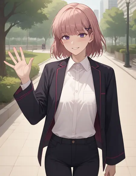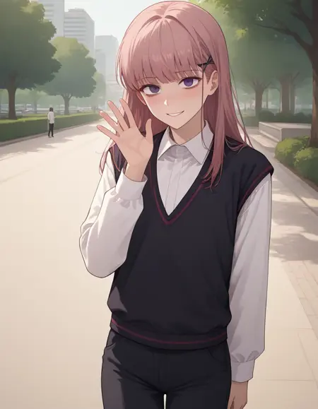 new park seo joon, 1girl, solo, medium hair, pink hair, bangs, black eyes, purple eyes, black vest, collared shirt, hair ornament, long sleeves, black sleeves, open clothes, black pants,