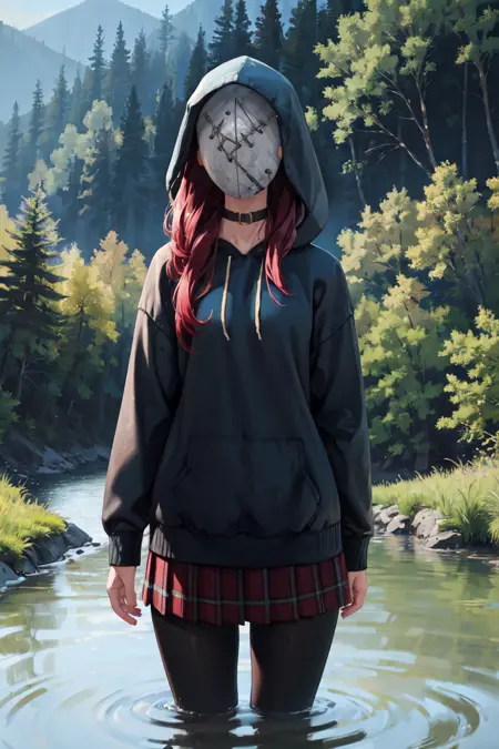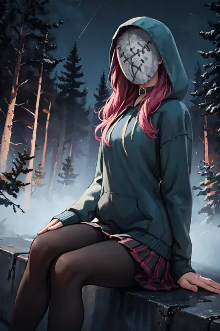 "LegionSusie, mask, plaid skirt, pantyhose, hoodie, hood up"
