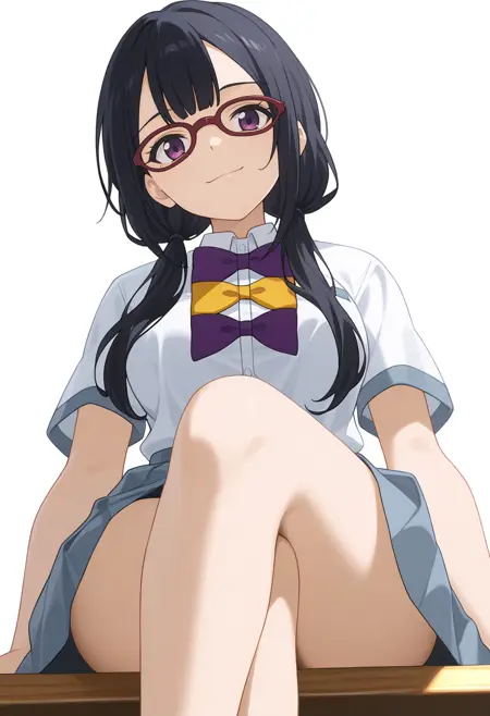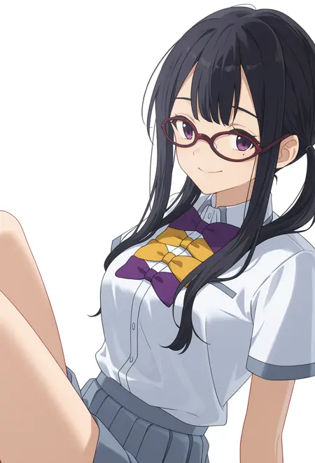 - yellow bowtie,purple bowtie,school uniform,skirt,white shirt,short sleeves,red-framed eyewear,
