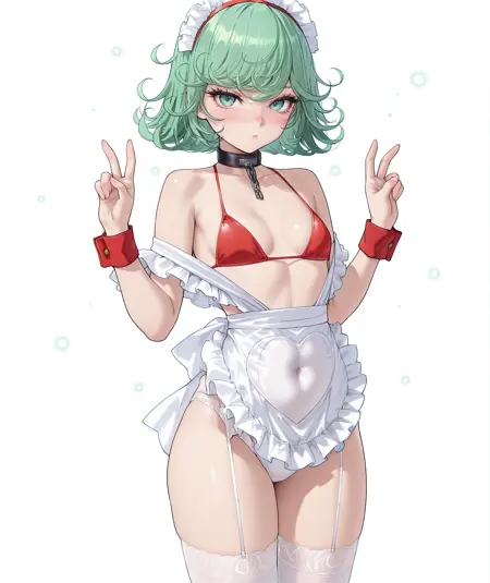 太ももハイズ、胸元、裸の肩、下着、鎖骨、パンツ、水着、ビキニ、太もも、フリル、チョーカー、白パンツ、エプロン、カラー、白い太ももハイズ、手首カフス、メイド頭飾り、チェーン、ガーターストラップ、白エプロン、ビキニトップのみ、メイドエプロン、レッドビキニ、フリルエプロン、壊れたチェーン、ほぼ裸のエプロン、おへそカバー、