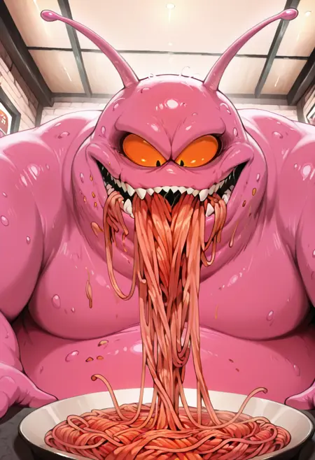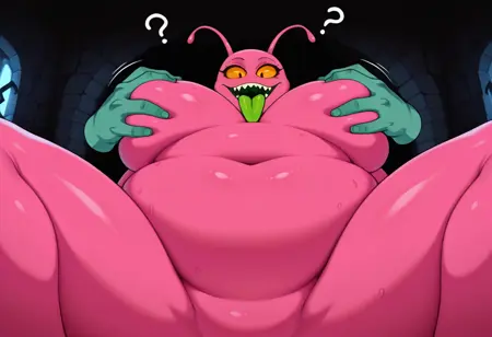 태그: 분홍색 피부, 녹색 혀(옵션), 날카로운 이, 콧날, 통통한 몸매, 괴물, 혀를 내밀기(옵션), 벌어진 입[또는 닫힌 입], 큰 꼬리[또는 꼬리], 주황색 공막, 검은 동공, 전체 몸(옵션), 전기코날에서 발산