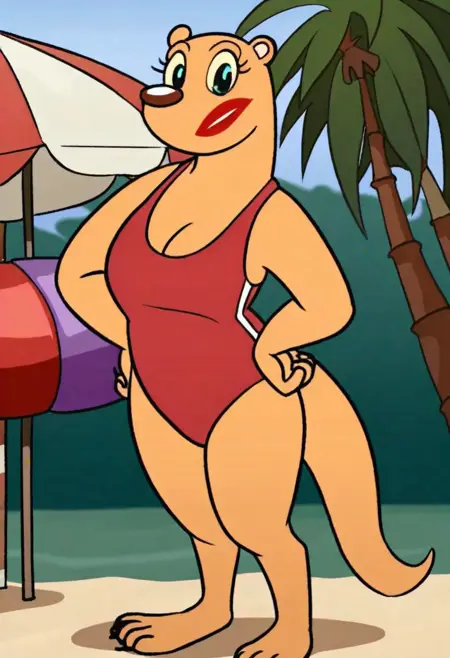 1girl, solo, otter girl, anthro, tail, red swimsuit, red lipstick, barefoot