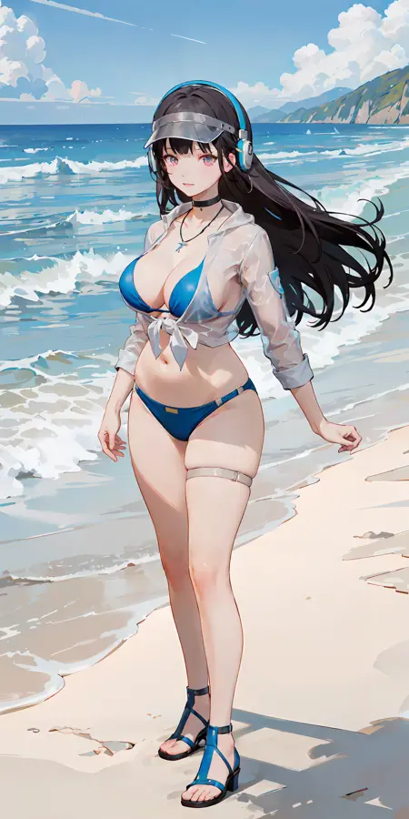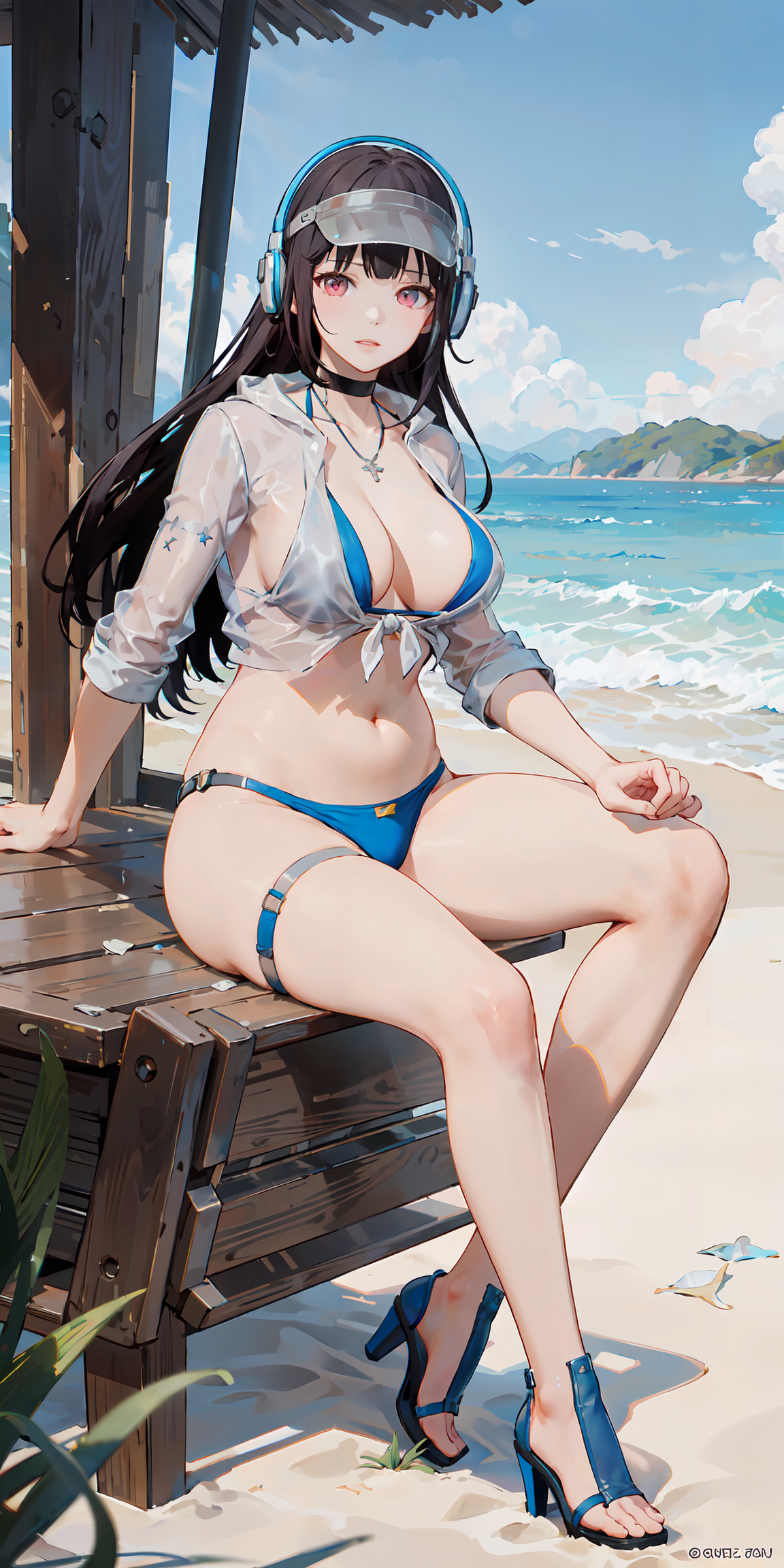 YAODZ, blue_bikini_under_clothes, see-through, necklace, black_choker, visor_cap, headphones, thigh_strap, sandals, long_hair, black_hair