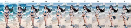 1.人物有概率出现瑕疵,请灵活使用photoshop或其它工具修复,过低的权重值可能会使人物眼睛颜色发生变化