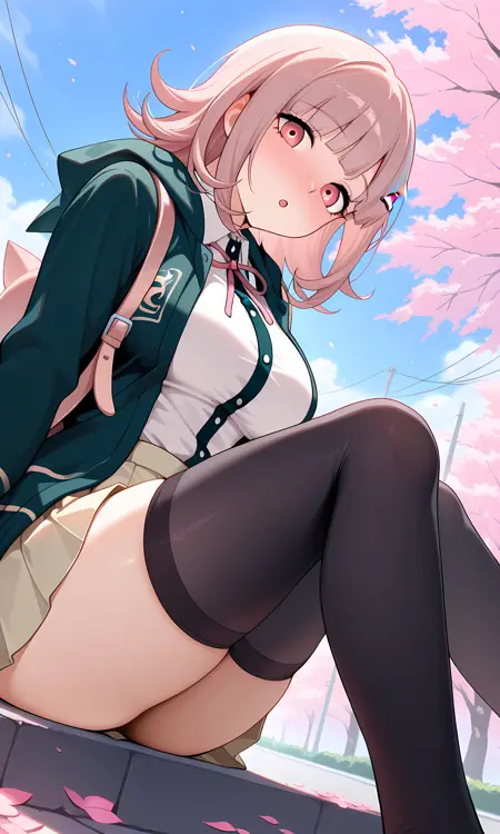 미니스커트, 오픈 재킷, 후드 재킷, 가방, 드레스 셔츠, 후드, 셔츠 단추 단축, 주름 스커트, 목 리본, 이-tone 셔츠, 긴 소매, 백팩, 분홍 리본, 칼라 셔츠, 검정 허벅지 긴 양말