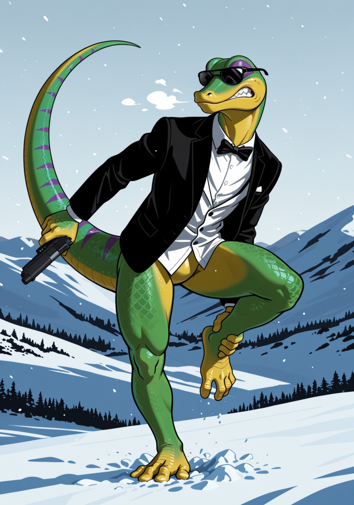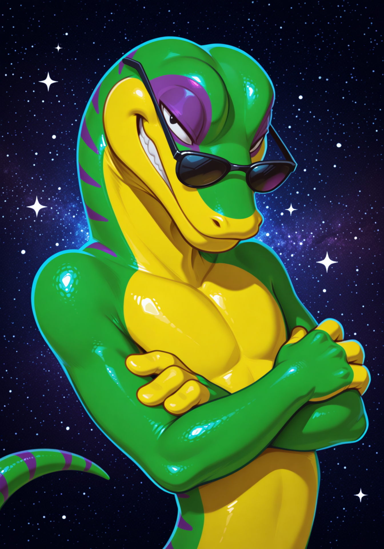 gex, solo, semi-anthro, 4 fingers, striped tail, striped back, sunglasses, smirk, featureless chest, detailed scales,