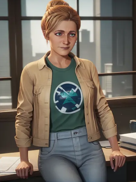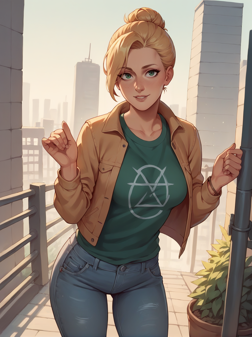 주 프롬프트: "금발 머리, 녹색 눈, 재킷, 바지, 녹색 셔츠"