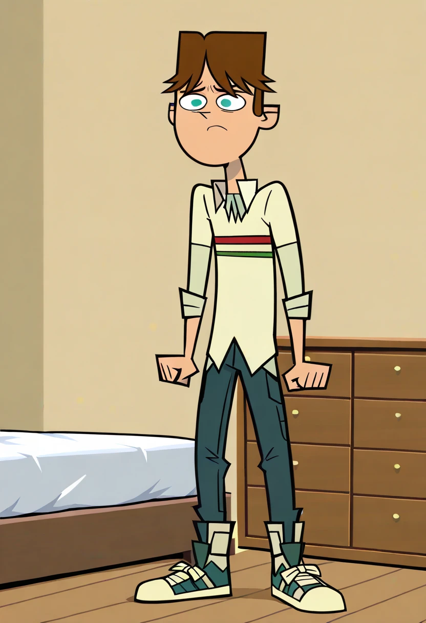 CodyTDI, 1boy, brown hair, teal eyes, cream-colored long-sleeved shirt with red and green stripes, dark green pants, cream-colored sneakers