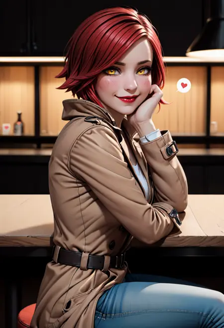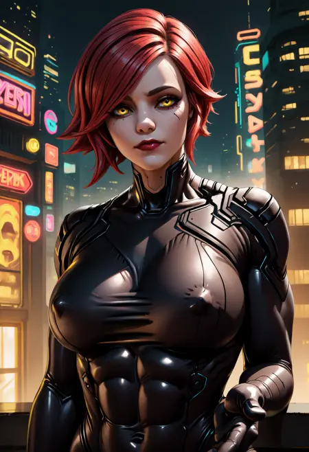 外見タグ: 片腕のタトゥー、お腹のタトゥー、胸のタトゥー、短い髪、赤髪、流ればっさり前髪、赤い唇、黄色い目