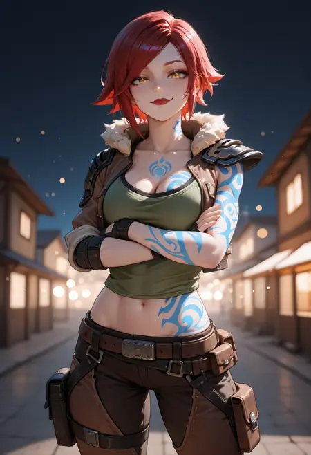 衣装タグ: 肩パッド、茶色のジャケット、毛皮縁取りジャケット、短めのジャケット、袖をまくった、片袖のみ、緑のタンクトップ、茶色のベルト、ベルトポーチ、お腹の露出、黒い手袋、フィンガーレスグローブ、茶色のチャップス、黒いズボン、太ももホルスター、膝パッド、黒いブーツ、膝上ブーツ