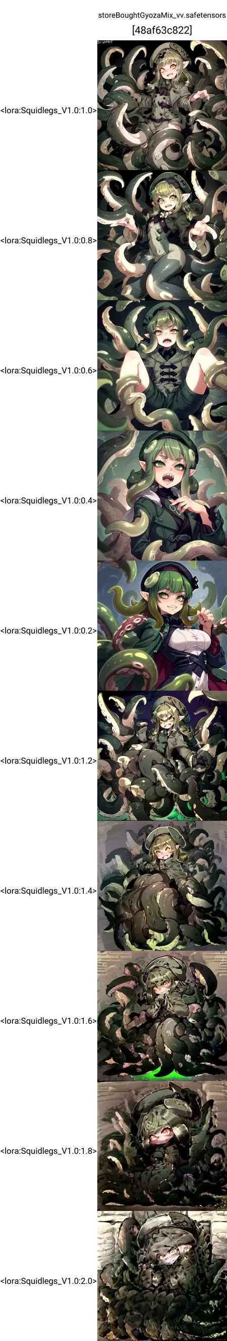 More weight more squid, past 1.2, heavy artefacting. See plot for example. Works well with anime models, specifically Store Bought Gyoza (餃子Mix). The LORA might add more than just squid legs - generally expect hair and eyes to take a hit too. Artefact of the training and the dataset, beggars can't be choosers. Can proudly say, dataset has minimal splatoon content, and no mature content.