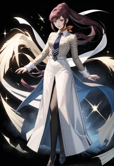 For her Persona 1 look its "school uniform, ponytail, necktie"