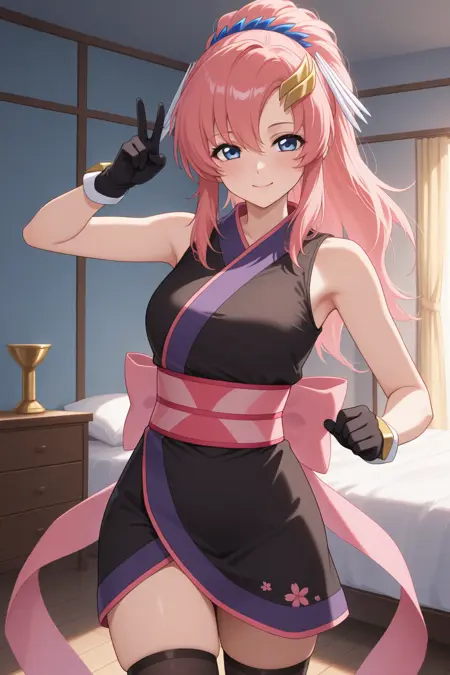 aalacus, 青い目, ピンクの髪, ポニーテール, 髪飾り, 黒い手袋, 日本衣装, 黒い着物, ピンクの帯, 袖なし, 黒い太ももハイズ,
