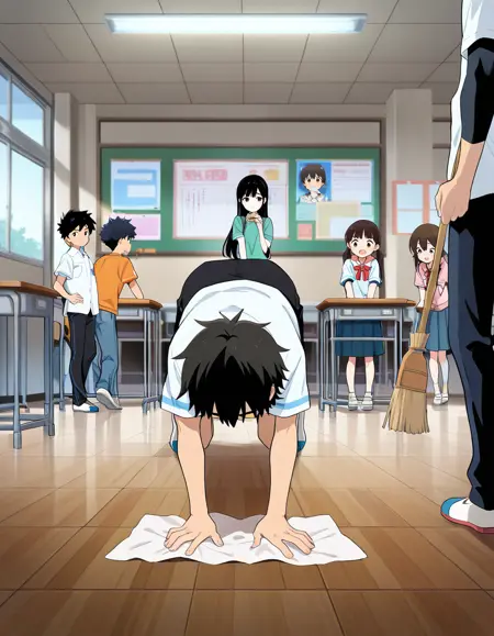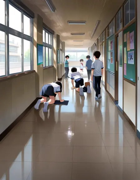 (classroom or school hallway), cleaning, wipe the floor, all fours,