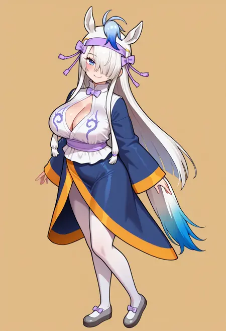 [외모 (디폴트)] gyokuryu \(kemono friends\), 말 소녀, 말 귀, 동물 귀, 추가 귀, 말 꼬리, 꼬리, 다색 머리카락, 흰 머리카락, 파란 머리카락, 줄무늬 머리카락, 아호게, 긴 머리카락, 비대칭 앞머리, 옆머리, 한쪽 눈을 가리는 머리카락, 머리 리본, 머리 장식, 머리 띠, 머리 튜브, 머리띠, 보라색 리본, 보라색 넥타이, 보라색 머리띠, 보라색 띠, 파란 눈, 큰 가슴,