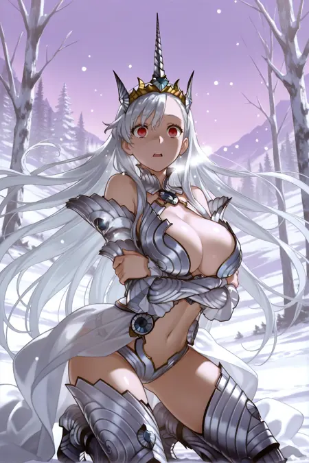为瓦尔基里 Riela 添加:"valrlmrc, 银发, 非常长的头发, 红眼睛, 漂浮的头发, 王冠, 单角, 比基尼盔甲, 银色盔甲, 分离的袖子, 银色长筒袜, 肚脐, 白色外裙"