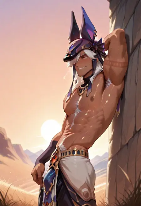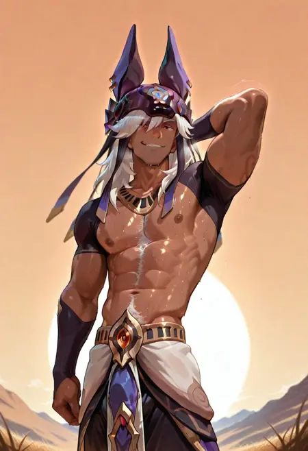 Cyno, headwear, red eyes, white hair, arm tattoo, dark skin