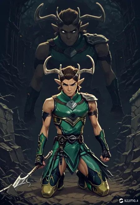 rhys, redeemed, mtg, elf, horns, pointy ears, long hair, brown hair, dark eyes, solo, weapon, armor, dual wielding, horns, male focus, holding, 1boy, sword