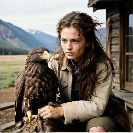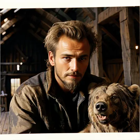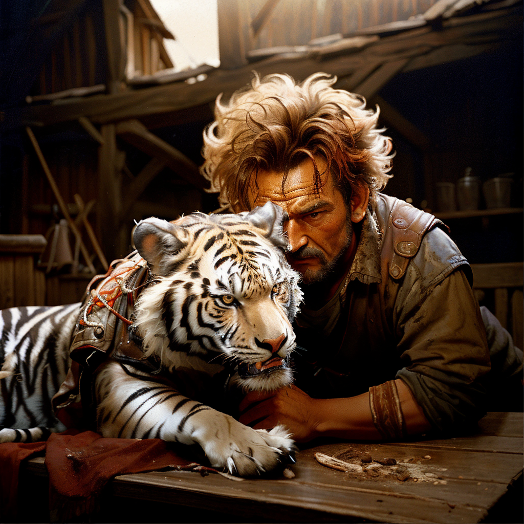 1boy, 1girl, animal, animal-trainer, bald, beard, bird, black hair, black shirt, blonde hair, blood, blue eyes, blurry, blurry background, boots, braid, brown hair, cat, closed mouth, coat, dark skin, day, depth of field, dirty, dust, facial hair, fangs, freckles, gloves, horns, indoors, jacket, jewelry, lamp, lion, lips, long hair, long sleeves, looking at viewer, male focus, manly, messy hair, mole, monster, mustache, necklace, old, old man, open mouth, pants, photo inset, realistic, scar, scarf, shirt, solo, table, tank top, teeth, tiger, vest, white hair, white shirt, wolf