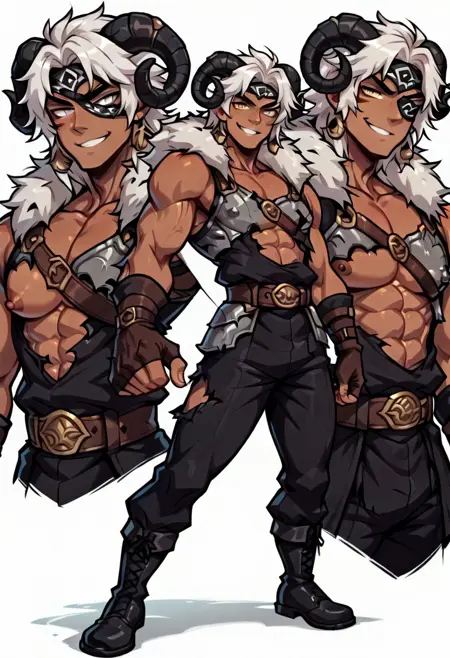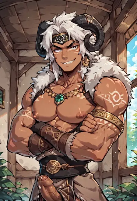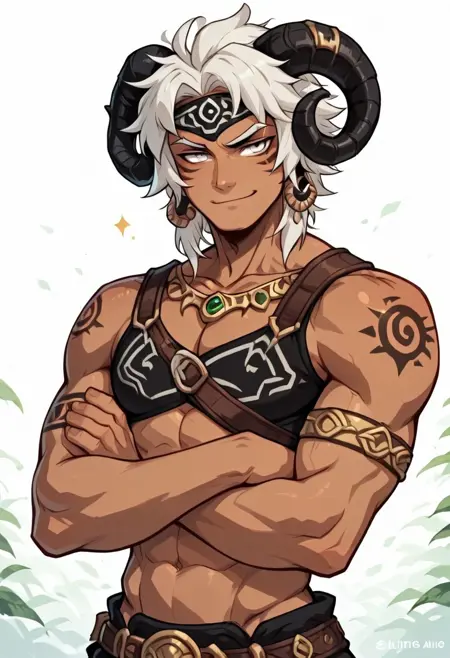 paaphi、森の、角のある、黒い角、巻き角、羊の角、白い髪、白い目、濃い肌、濃い肌の男性、筋肉質、筋肉質の男性、バラ、胸板、腹筋、上半身、イヤリング、ジュエリー、ヘッドバンド