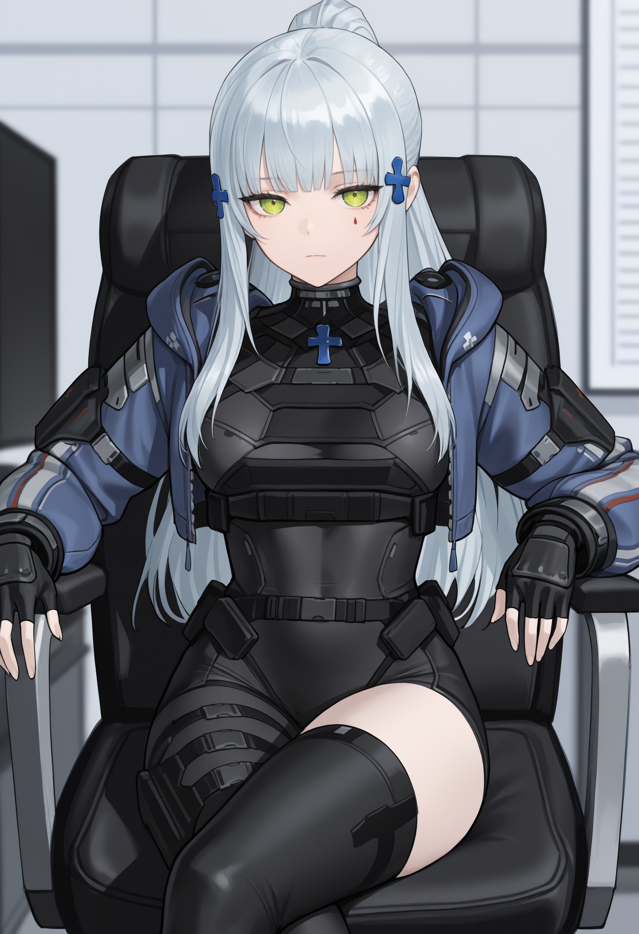 아스트랄 루미너스: kluk4iastral, teardrop facial mark, long hair, grey hair, sidelocks, cross hair ornament, green eyes, tactical clothes, blue jacket, hooded jacket, hood down, cropped jacket, open jacket, long sleeves, black gloves, fingerless gloves, black bodysuit, black thighhighs, single thighhigh
