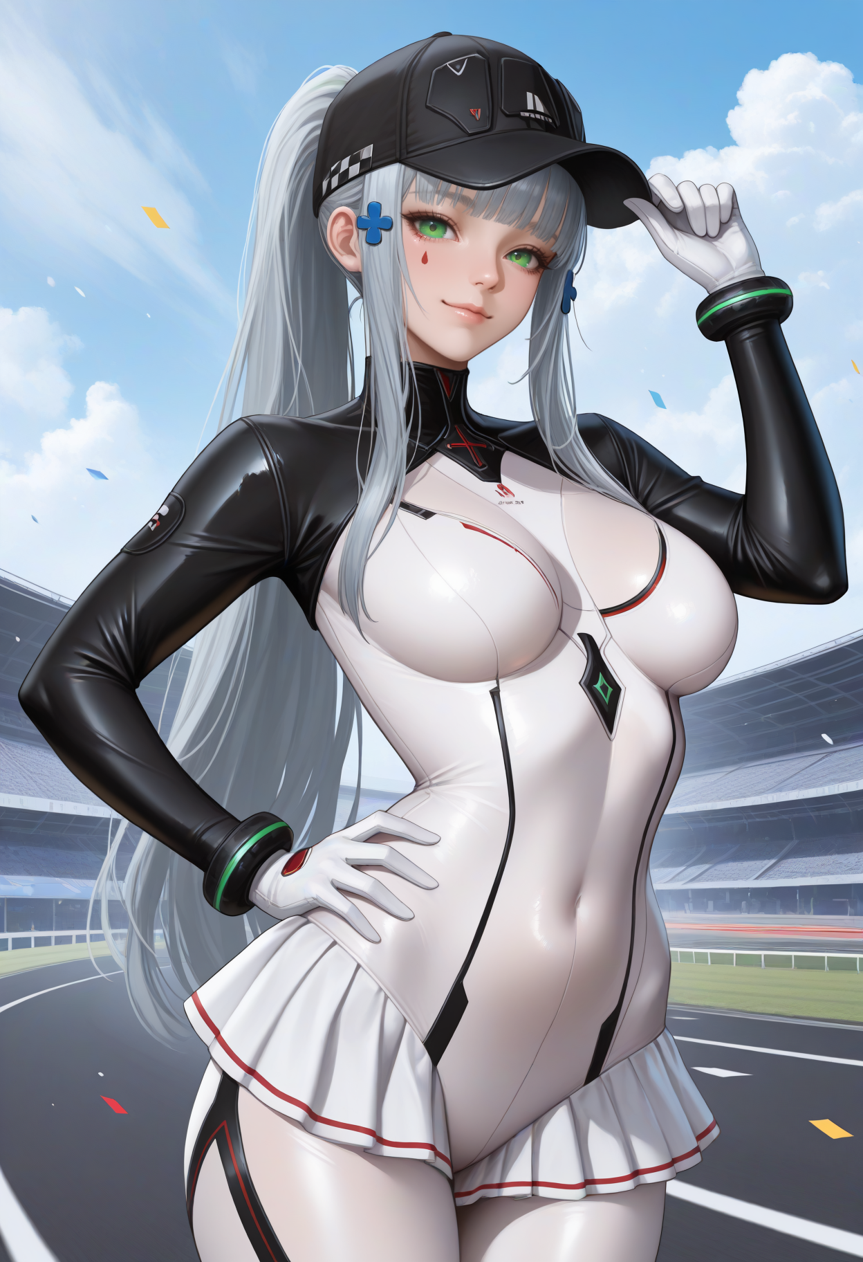 스피드 스타: kluk4ispd, teardrop facial mark, long hair, grey hair, sidelocks, cross hair ornament, black headwear, baseball cap, green eyes, black shrug \(clothing\), white bodysuit, white gloves, white skirt, microskirt, pleated skirt